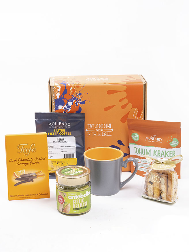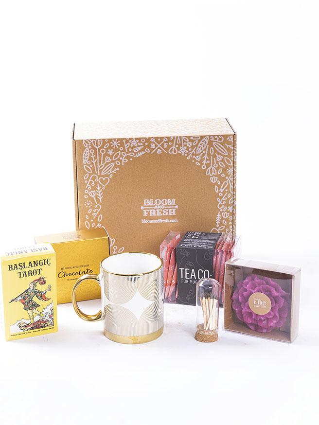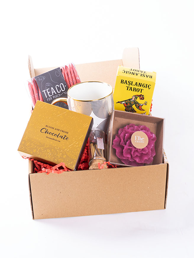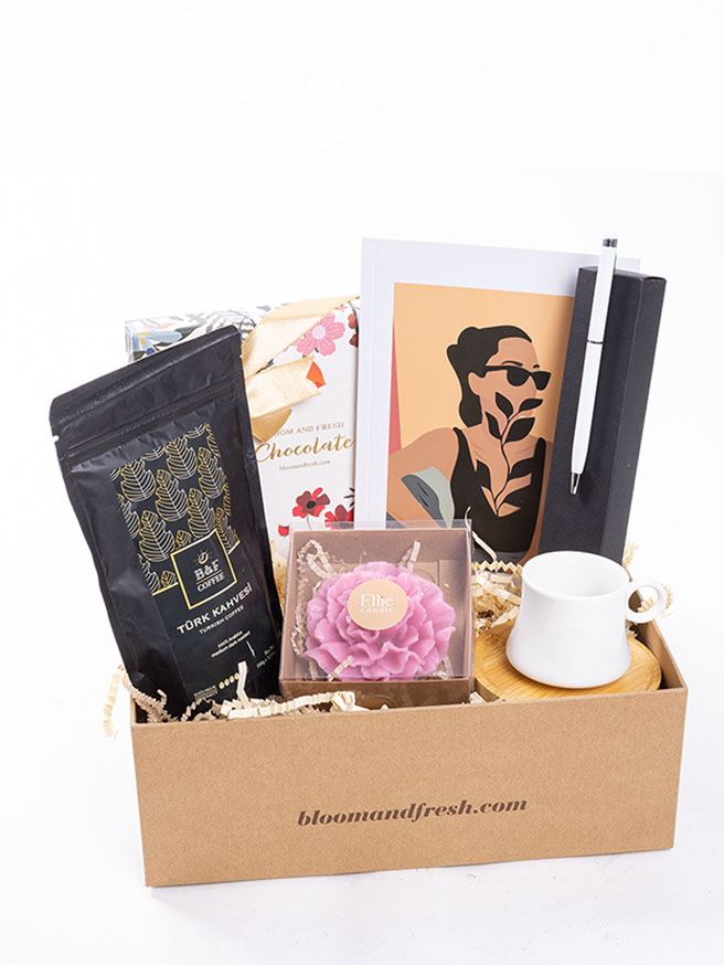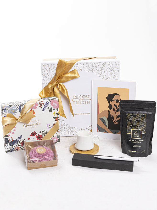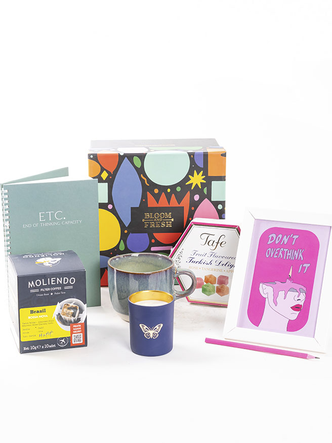 Birbirinden özel ve içerisinde çikolatadan kahve çekirdeğine, french press'ten mug'a kadar çeşitli ürünler olan butik hediye kutuları Bloom & Fresh'te.